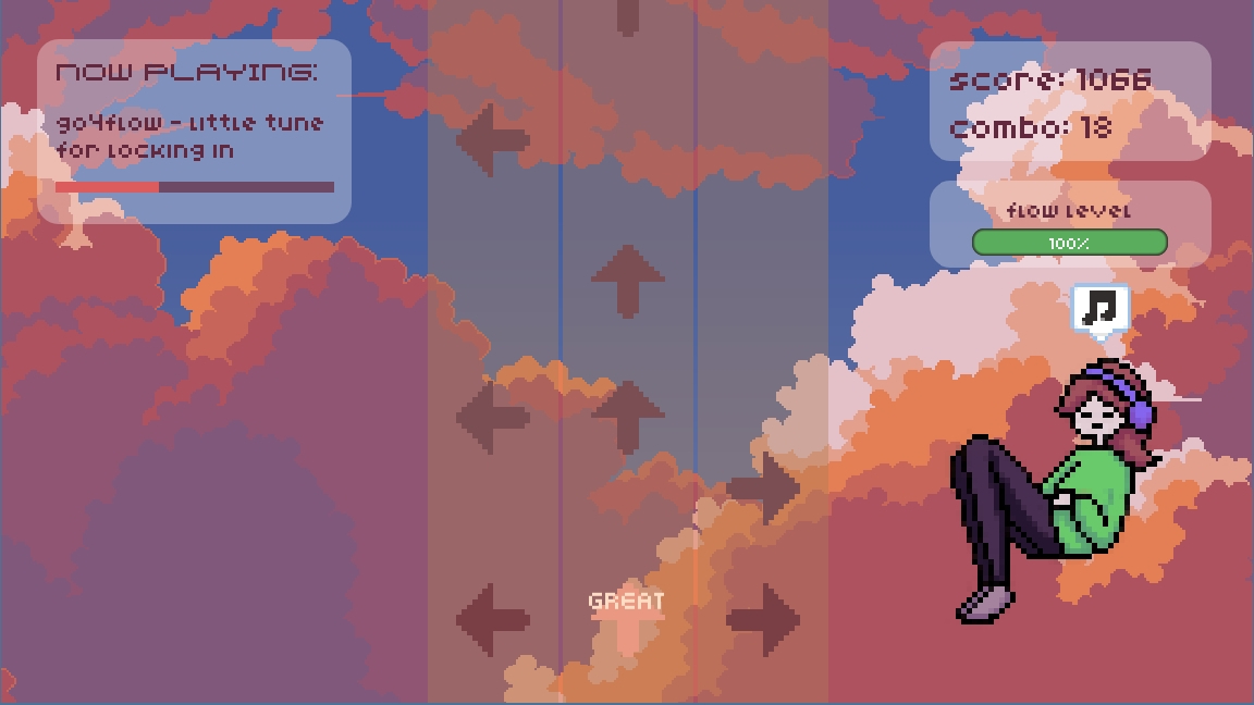 Hit the matching arrow keys in time with the beat to stay in the "flow state". Don't let the bar hit zero before the song ends.